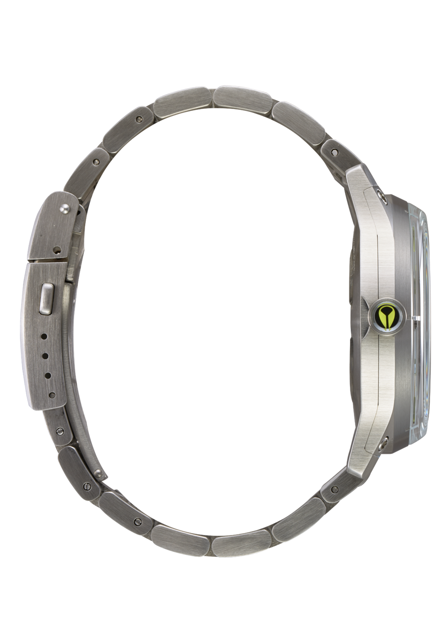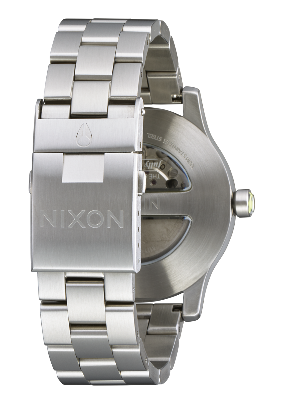 The unique two-piece design eliminates the need for a traditional caseback, while the split window gives a view of the inner workings of the automatic movement and the custom crystal shape flows seamlessly into the case with angled edges. The domed dial features LUME block indices and LUME accents on the hands for visibility even in low light conditions.