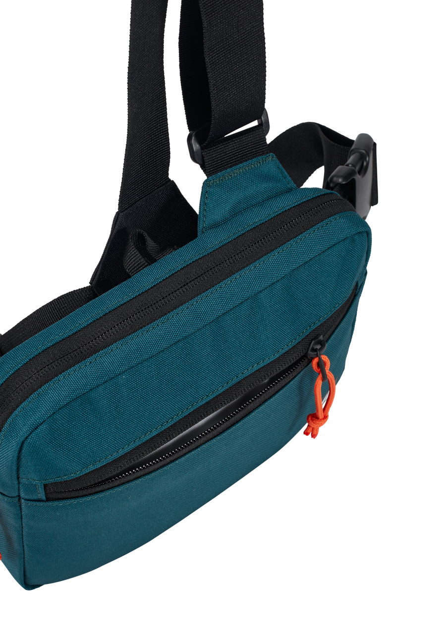 Breathable mesh back panel facilitates airflow and cuts down on sweat. Front-facing harness design adds style to the functionality and security of the Bandit. Internal and external zippered pockets and internal organizers like a key clip and slip pockets.