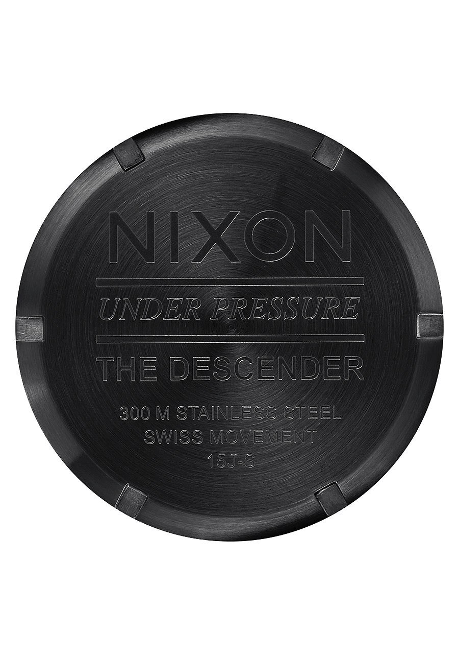 The shark tooth knurled crown is framed with the built-in crown protector. Crown is placed at 9 o’clock to prevent “wrist bite” during activities. Also features a unidirectional rotating bezel for an analog countdown timer.