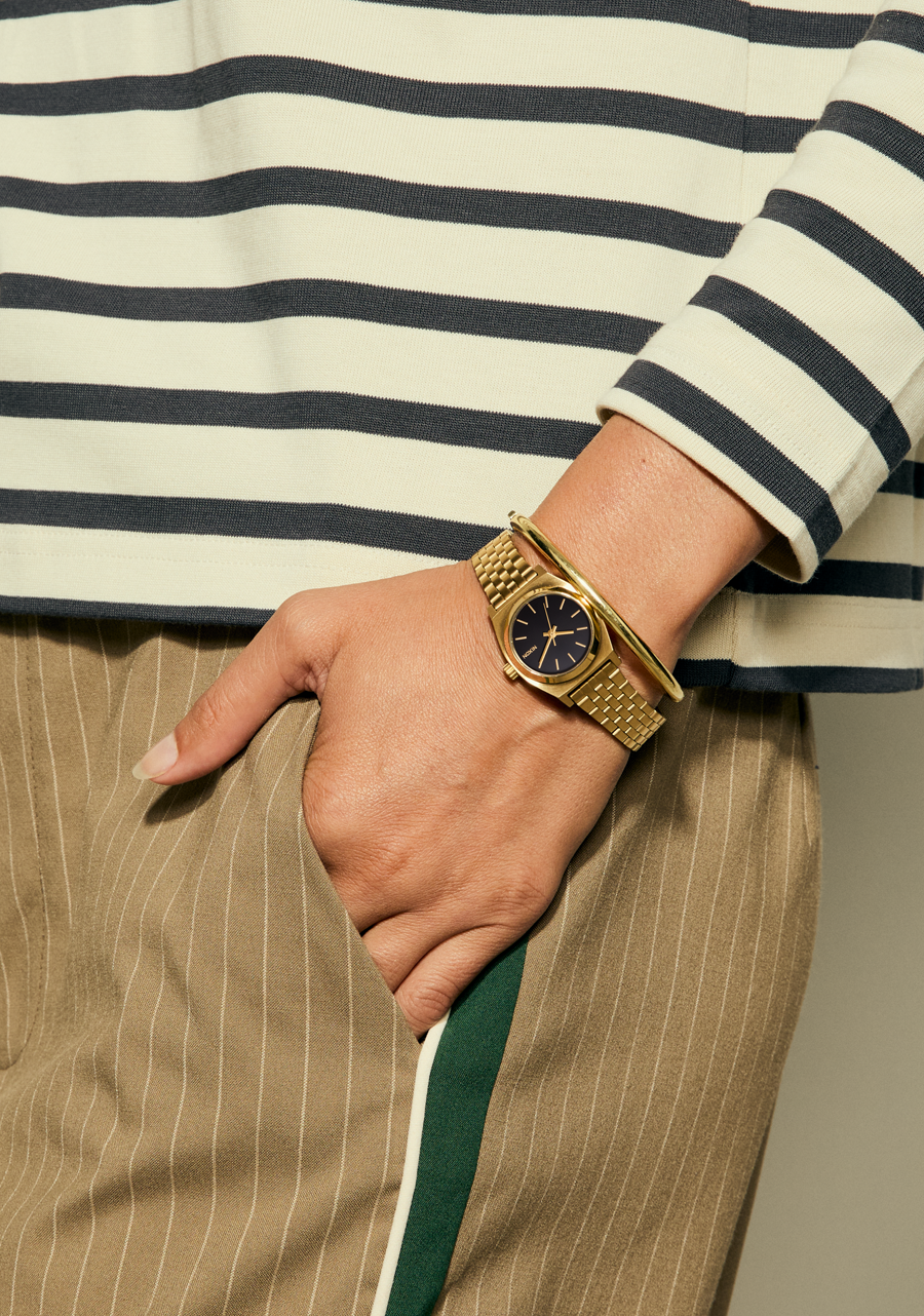 The Small Time Teller bracelet watch features a deployant clasp for a secure fit. This type of clasp allows the watch to open and close easily while providing a snug fit around the wrist. It also ships with a special tool that can be used to adjust the size of the bracelet. Learn more about resizing this watch at our blog.