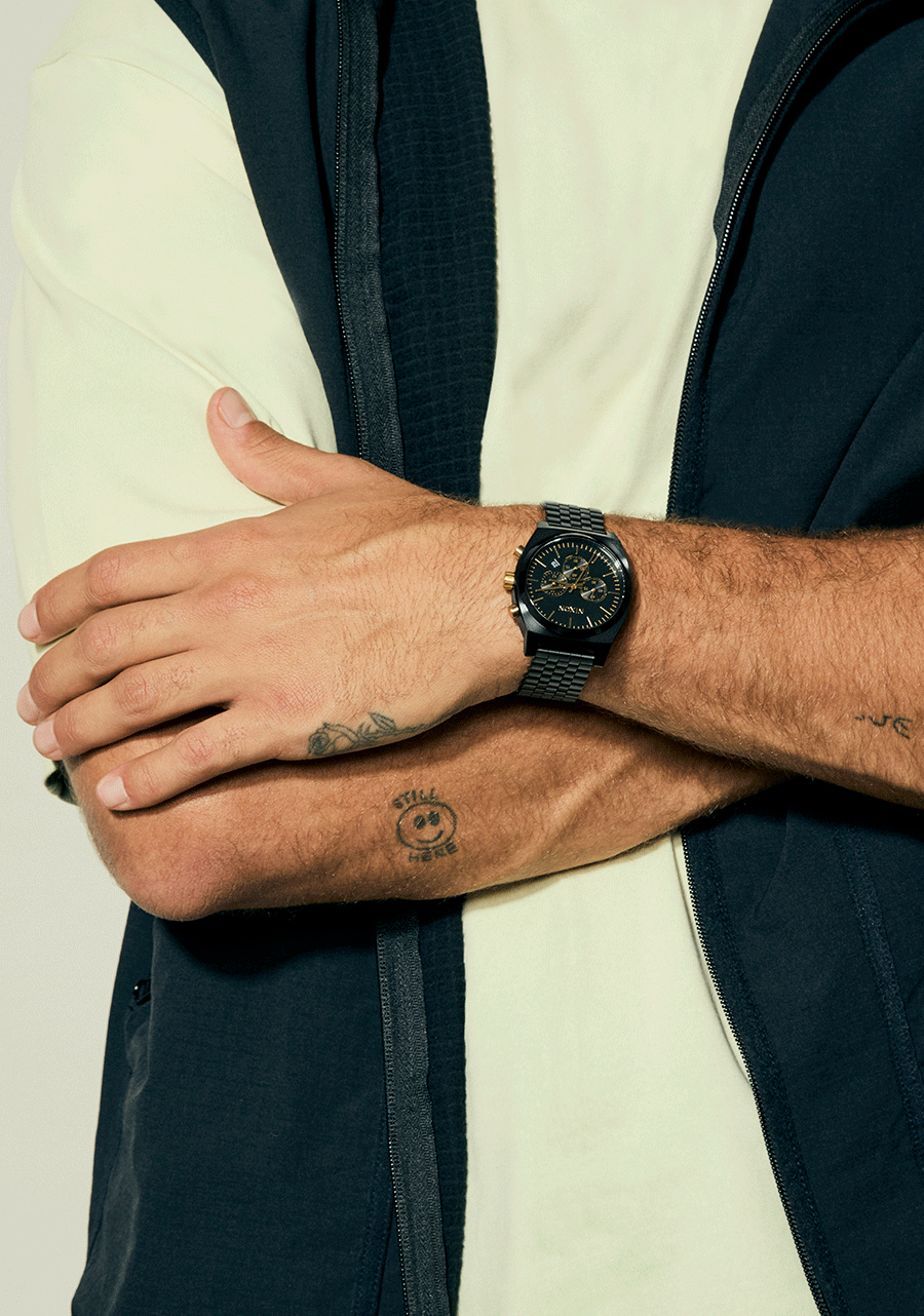 The main second hand tracks chronograph seconds. 2 o’clock subdial tracks 24-hour time. The 6 o’clock subdial tracks seconds. The 10 o’clock subdial tracks chronograph minutes.